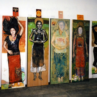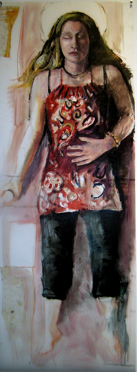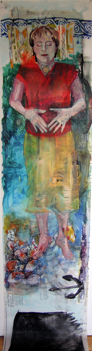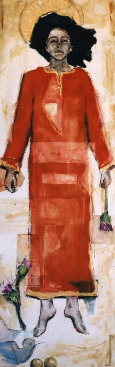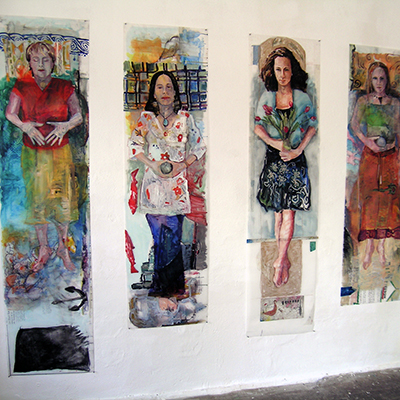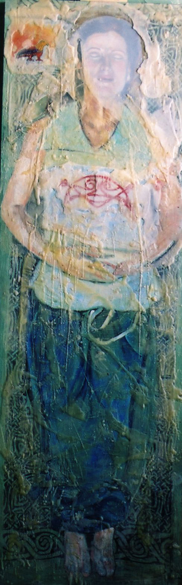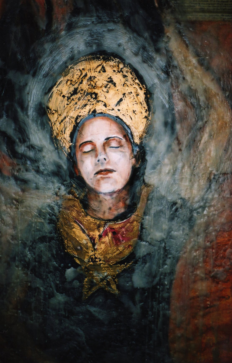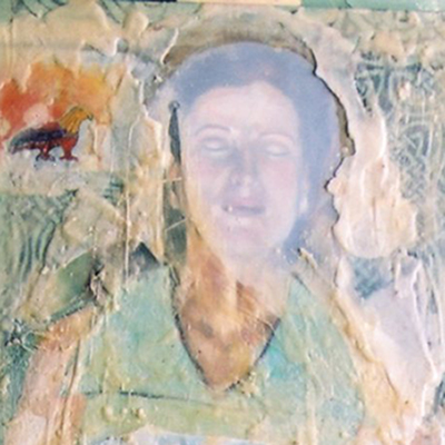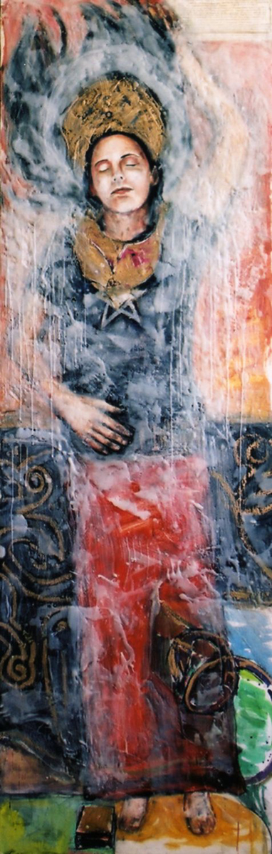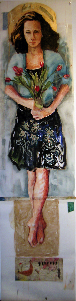 Gouache, acrylic, charcoal, oil stick, wax, paper, Mylar on wood